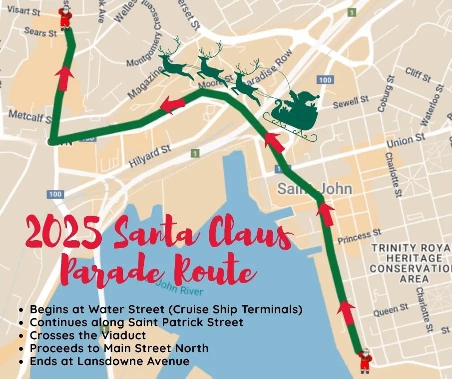 Come see the 72nd Annual Saint John Santa Claus Parade - with a new route for 2025! The parade will begin at the Cruise Ship Terminals on Water Street, continue along Saint Patrick Street, and then follow the traditional route across the Viaduct to Main Street North and Lansdowne Avenue.